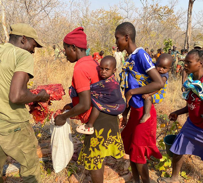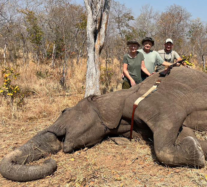 If the first day was intense, day two was pure adrenaline. Tracking through thick bush, AJ and professional hunter York Mare closed the gap on a tuskless cow elephant—old, calf-less, and the perfect candidate. The team slipped within 15 meters before the elephant suddenly spun to face them. AJ fired a frontal with his double rifle and missed the brain. The cow turned to bolt, and in a flash, AJ swung and sent the second barrel home with a devastating side brain shot. The hunt was over in seconds, and the celebration began. As always, all the meat went straight to the local community, ensuring nothing was wasted.